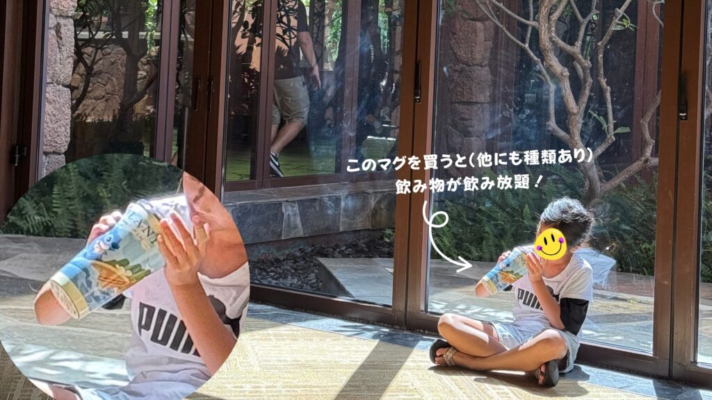 アウラニには、指定のリフィルマグを購入すれば、ソフトドリンクが飲み放題になるサービスがあります。