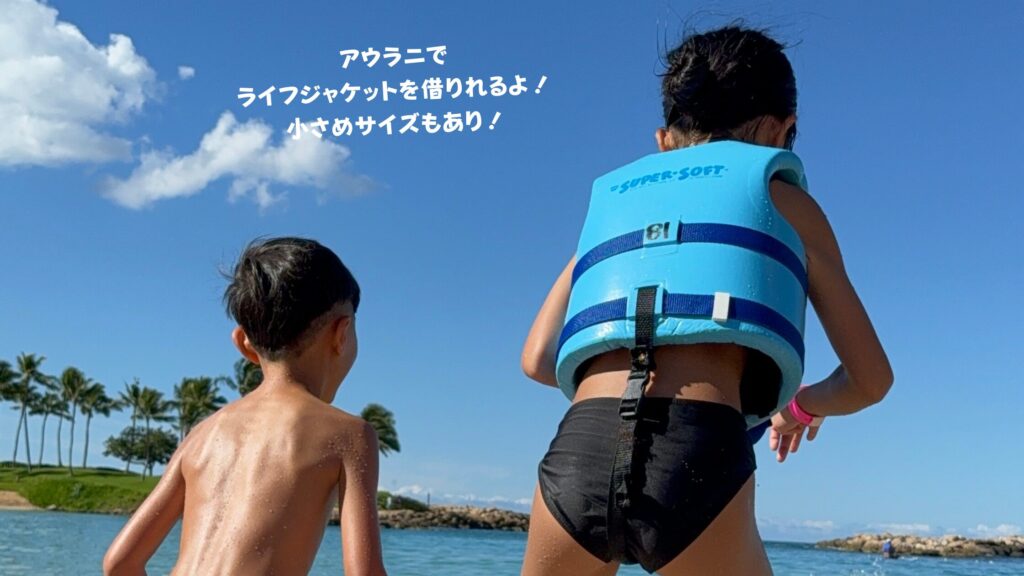 子どもたちにとって重要なライフジャケットは、アウラニでは無料で貸し出ししていました。